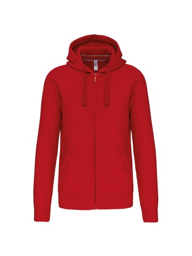 80% algodão/20% poliéster. Algodão penteado. Interior cardado. Mangas direitas. Fecho em nylon. Capuz forrado com cordão de ajuste à cor. Bolsos à canguru. Acabamento da manga e cós em malha rib.